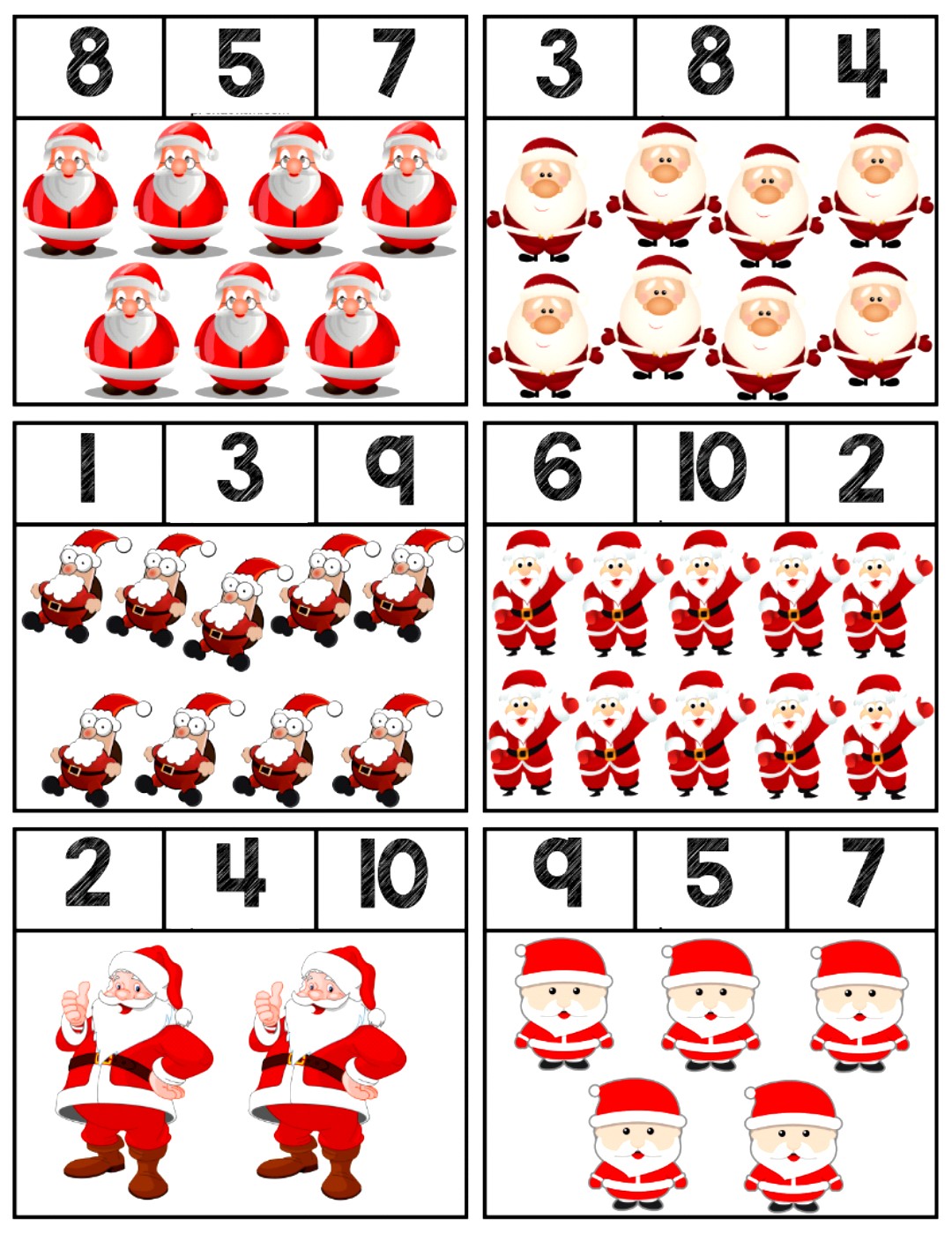 Fichas coloridas e ilustradas com a temática natalina para a realização de pareamento numérico...